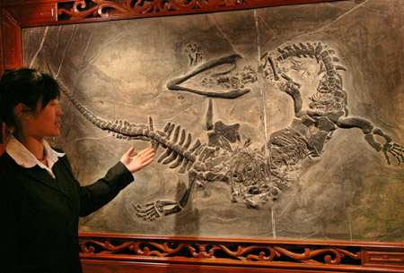 An interpreter introduces the fossil of a Keichousaurus which measures 2.7 meters long and has two horns at a museum in Anshun, east China's Anhui Province, June 10, 2007. The limestone also shows three other small dinosaurs which is rare to find. [newsphoto] |