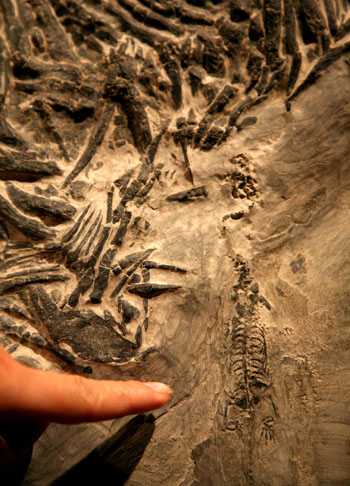 An interpreter points at the fossil of a small Keichousaurus on a limesone at a museum in Anshun, east China's Anhui Province, June 10, 2007. [newsphoto]