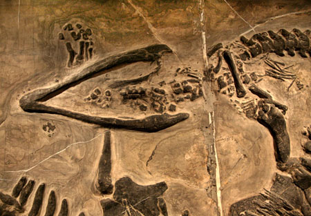 The fossil of a Keichousaurus which measured 2.7 metres long and has two horns is on display at a museum in Anshun, east China's Anhui Province, June 10, 2007.The limestone also shows three other small dinosaurs which is rare to find. [newsphoto]