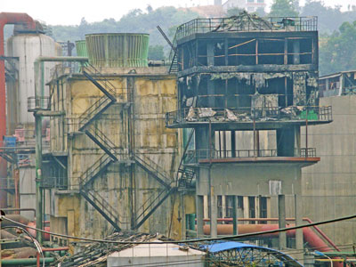 The site of a gas explosion which ripped through a workshop at a fertilizer plant is seen in Yihua, Central China's Hubei Province June 11, 2007. The blast occurred at about 8 pm on Monday, wounding 30 at the site. A gas leak was confirmed as the cause of the explosion. The workshop suspended operation immediately after the accident. [Newsphoto]