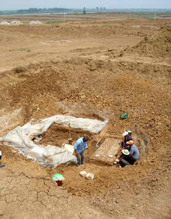 Archeologists unearth two human skeletal remains from a tomb dated before the Qin Dynasty (221BC - 206BC) in Fengyang, East China's Anhui Province, June 12, 2007. Nine people were excavated along with bronze cooking vessels and chimes. [newsphoto] |
