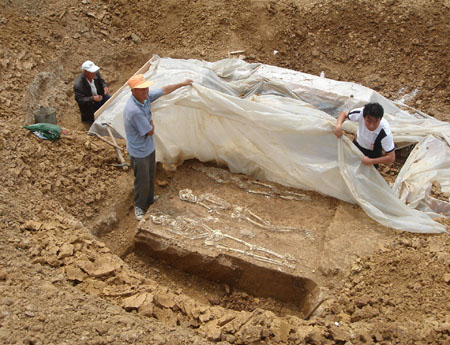 Archeologists unearth two human skeletal remains from a tomb dated before the Qin Dynasty (221BC - 206BC) in Fengyang, East China's Anhui Province, June 12, 2007. Nine people were excavated along with bronze cooking vessels and chimes. [newsphoto]