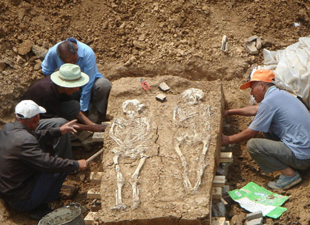 Archeologists unearth two human skeletal remains from a tomb dated before the Qin Dynasty (221BC - 206BC) in Fengyang, East China's Anhui Province, June 12, 2007. Nine people were excavated along with bronze cooking vessels and chimes. [newsphoto]
