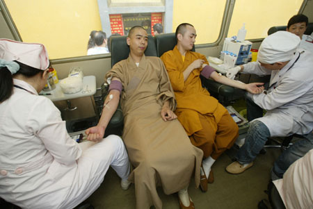 Two monks from Shanghai's jade buddha Temple donate blood on Friday June