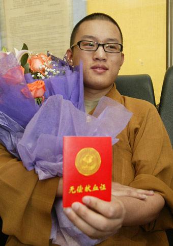 A monk from Shanghai's jade buddha Temple shows his blood donation