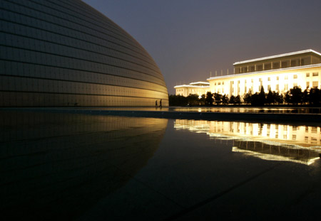 People walk in front of the "National Grand Theater" as water fills its surroundings beside the Great Hall of the People (R) at night in Beijing June 16, 2007. Construction of the theatre will be completed in September, and the first performance is scheduled for October 1, the National Day. [Reuters]