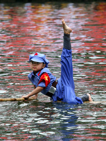 A young girl in a Red Army costume kicks her leg in the air during the Kong Zhu Piao contest, or single bamboo rafting, in which competitors must get across the water on a bamboo pole while striking difficult poses, in Zunyi, South China's Guizhou Province, June 18, 2007. [newsphoto] |