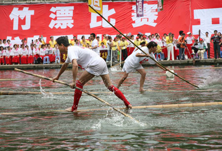 Contestants sail on bamboo