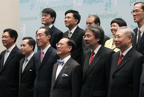 Front row L-R) Secretary for Commerce and Economic Development Frederick Ma, Secretary for Justice Wong Yan Lung, Chief Secretary for Administration Henry Tang, Hong Kong Chief Executive Donald Tsang, Financial Secretary John Tsang, Secretary for Education Michael Suen, (Back row L-R) Secretary for the Environment Edward Yau, Secretary for Financial Services and the Treasury K C Chan, Secretary for Labour and Welfare Matthew Cheung, Secretary for the Civil Service Denise Yue and Secretary for Home Affairs Tsang Tak-sing attend a news conference to announce the new team of principal officials appointed in Hong Kong June 23, 2007. [Reuters]