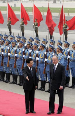 China's President Hu Jintao (L) shows the way to Spain's King Juan