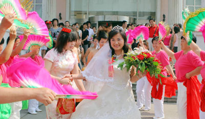 A bride is accompanied during a wedding ceremony in Tianjin Municipality June 28, 2007. [Xinhua]