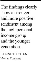 positive sentiment in the Hong Kong market than before. The Nielsen Company, a Dutch media conglomerate, interviewed more than 1,000 Hong Kong people aged between 18 and 54 in May. The online survey focused mainly on the city's changing attitudes toward life and improved market sentiment since 1997. Nielsen, the parent company of famous international marketing research firm AC Nielsen, found that over 60 percent of the city people have a pretty decent income - HK$20,000 or more. About 42 percent of Hong Kong people are confident about the home market in the years to come. "The findings clearly show a stronger and more positive sentiment among the high personal income group and the younger generation. Not only are the rich getting richer, but they are also the happiest crowd among all income groups," said Kenneth Chan, Associate Director, for customized research in Nielsen. The group reveals that Hong Kong consumer sentiment is at an all-time high, and high technology has well shaped people's daily life. A decade ago, some 35 percent consumers in the city had mobile phones, but the number has jumped to 95 percent now. That means nearly all Hong Kong people can be reached by the cell phones today. And 81 percent own a desktop computer against 38 percent 10 years ago. About 58 percent people have digital cameras now, double that of four years ago. "The past decade has been historic for Hong Kong, not only because 2007 marks 10 years since Hong Kong came under the Chinese sovereignty but also because Hong Kong people have experienced roller coaster ride in lifestyle over the same period," Chan said at press briefing yesterday. The Nielsen report also indicated that Hong Kong consumers have become more health conscious and convenience-driven than before. A global aging trend, various concerns about health and tough working conditions in the past decade have been wake-up calls for many consumers, who have become more health conscious. However, fast-paced Hongkongers are more relying on fast food and quick service, giving rise to the awareness in health concept and the rapid development of convenience stores.