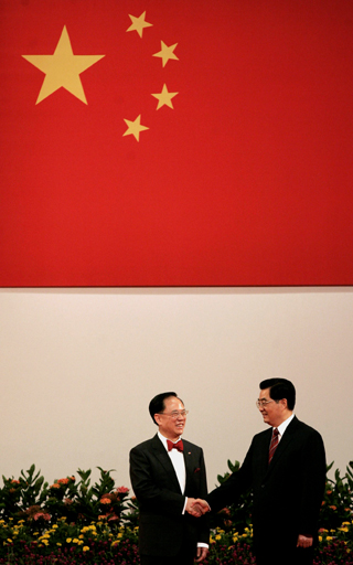 Chinese President Hu Jintao (R) shakes hand with Hong Kong's Chief Executive Donald Tsang during an inaugural ceremony in Hong Kong July 1, 2007. [Reuters]