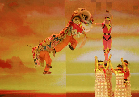 Mainland acrobats showed off daredevil moves, spinning dishes on the ends of