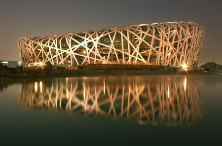 A general view shows the illuminated National Olympic Stadium, also known as the Bird's Nest, on July 1, 2007. Two of the stadium's general electric power systems have been put through to the first power supply at a nearby transformer substation, while the other three power supply projects are still under construction. [China Foto Press]
