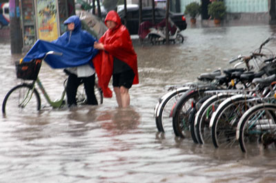 Cyclists wade through a water-clogged street after heavy rain in Bozhou, East China's Anhui Province July 5, 2007. More rain was forcast by the local meteorological station. [Newsphoto]