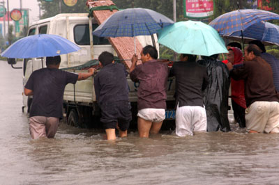 Residents help push a vehicle broke down on a flooded street after heavy rain in Bozhou, East China's Anhui Province July 5, 2007. More rain was forcast by the local meteorological station. [Newsphoto]