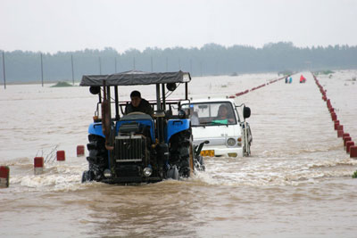 Vehicles move along a flooded street after heavy rain in Bozhou, East China's Anhui Province July 5, 2007. More rain was forcast by the local meteorological station. [Newsphoto]