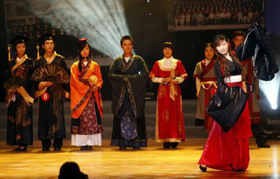 This year's graduates at Peking University model Chinese-style graduation robes selected for the finals of a design contest, July 3, 2007 in Beijing. The winning design is likely to replace western-style robes for graduates at this university. [China Foto Press]