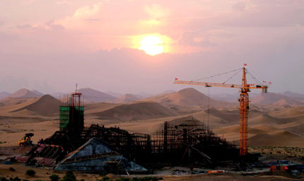 A tourist facility is under construction in a desert geologic park in Alashan, Inner Mongolia Autonomous Region July 6, 2007. The vast Alashan desert geologic park, comprising of Badain Jaran, Tengger and Ulan Buh deserts, is planned and under construction. In the 938.4-square-kilometer park, there will be rich tourism resources, including desert, Gobi, sand dunes, lakes, stone forests and fossils. [Xinhua]
