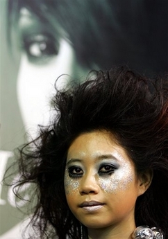 A model displays a style during a demonstration at the China International Beauty Week, which opened in Beijing Monday July 9, 2007. The Beauty Week features demonstrations, lectures and seminars about the hairdressing industry. [AP]