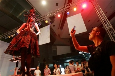 A man takes a photo of a model during a demonstration at the China International Beauty Week, which opened in Beijing Monday July 9, 2007. The Beauty Week features demonstrations, lectures and seminars about the hairdressing industry. [AP]
