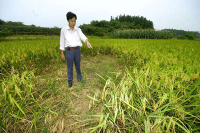 A local authority points at the cropland chomped by mice in Yueyang of central China's Hunan Province, Tuesday, July 10, 2007. An estimated 2 billion field mice are chomping their way hungrily through crops in 22 counties around the Dongting Lake in Hunan after their homes on islands in the lake were flooded, Xinhua said. Local authorities in Yiyang, Yuanjiang, Junshan and Huarong are rushing to build walls and dig ditches to keep the mice away from flood-control dikes and cropland. [AP]