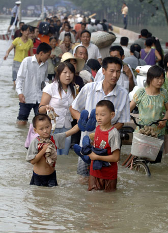 Local villagers manage their ways through the floods in Wangjiaba County, east China's Anhui province, July 11, 2007. Residents will get compensation from the government for their flooded home. [Reuters]