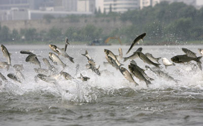 Fish jump out of water at a lake during sultry weather in Nanjing in east China's Jiangsu province July 16, 2007. [Reuters]
