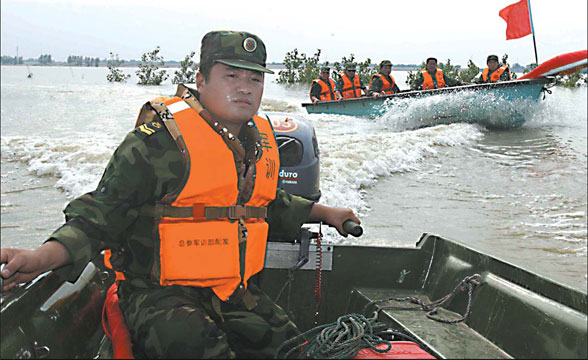 flooded areas in an operation to save lives and property in Fuyang, Anhui