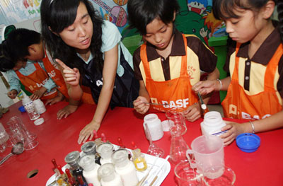 "I'm very pleased to teach these young kids something about chemistry and it's good for them," said the young man who has been a volunteer teacher of Kids' Lab for a second year. BASF, the world's leading chemical company, staged its sixth annual educational program Kids' Lab at Beijing Science and Technology Museum, for the sixth consecutive year, on Monday. The week-long program, which was staged in Shanghai early July before coming to the national capital, is aimed at bringing fun and innovative chemistry to children while raising public awareness of sustainable development, according to the company. "We at BASF believe that chemistry makes our lives better," said Joerg Wuttke, chief representative of BASF China, at the opening ceremony. "BASF Kids' Lab wants to contribute to a better understanding of innovation built on chemistry," he said. So far, over 60,000 Chinese students had attended the previous five Kids' Labs, which included a series of experiments such as "Superabsorber", "Chalk Chromatography" and "Paper Making". This year, young visitors will see two new experiments -- "Recycling of Dirty Water" and "Where is Vitamin C?". |
