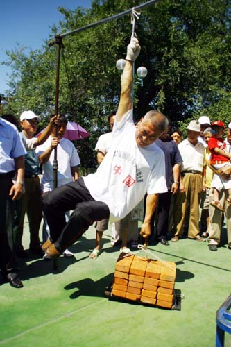 Ji Fengshan, 59, does pull-ups with one finger while carrying a load of 270 kilograms with another at a local park in Harbin, capital of northeast China's Heilongjiang Province, on July 23, 2007. [newsphoto]