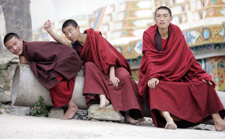 Tibetan monks rest at the Ga Kye Gu Monastery in Yushu, west China's Qinghai province July 26, 2007.  [Reuters]