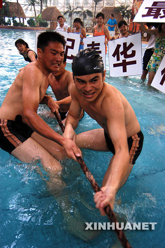 Water is a cool weapon to beat the summer heat, and it's even cooler to play a tug-of-war in the water. Members from twelve teams, all in swimming trunks, rivaled each other in a tug-of-war game in a pool at an amusement park in Weifang, eastern China's Shandong province, on Saturday, July 28, 2007. [Xinhuanet]