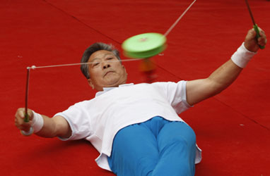 An elderly man spins a top to showcase Chinese traditional recreational games, or Doukongzhu, during activities to mark a one-year-countdown to the 2008 Olympic Games in Beijing, August 3, 2007. The Chinese capital is gearing up to celebrate the countdown to the opening ceremony of the next Olympic Games on August 8, 2008. [Reuters]