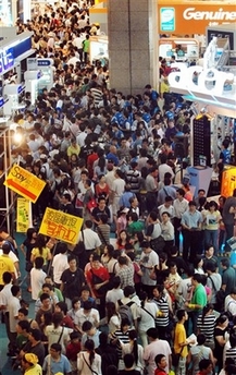 Taiwanese people gather to view an array of products at the Taipei Computer Applications Show, Saturday, Aug. 4, 2007, in Taipei, Taiwan. The exhibition showcases over 200 computer and peripherals companies from Taiwan and across the globe. [AP]