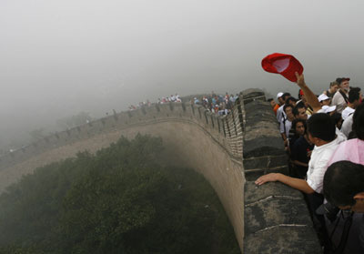A tourist guide waves his cap to his group at the Badaling section of the Great Wall on the outskirts of Beijing during heavy fog in Beijing August 4, 2007. [Reuters]