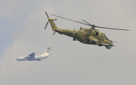 A helicopter and an Il-76 freight carrier are seen during the Peace Mission 2007 counter-terrorist exercise of Shanghai Cooperation Organization in Russia, August 6, 2007.[Xinhua] |