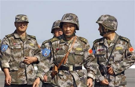 Chinese military personnel seen while preparing for the upcoming six-nation Central Asian anti-terrorism drill in Chelyabinsk region, about 2,100 kilometers (1,300 miles) east of Moscow on Monday, Aug. 6, 2007.  [AP]