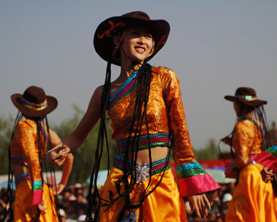 Actresses perform at a tourism festival in Pingjibao Farm in Northwest China's Ningxia Hui Autonomous Region August 11, 2007. [Xinhua]