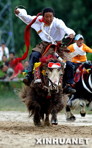 A suburban herdsman competes in a yak race to mark the Shoton festival in Lhasa, capital of southwest China's Tibet Autonomous Region on August 14, 2007. The Festival, which dates back to the 11th century as a religious activity for pilgrims to serve yogurt to monks and nuns who finished their summer retreat, had gradually become a theatrical event by mid-17th century. The Shoton Festival was inscribed on the list of China Intangible Cultural Heritage in May last year. [Xinhua]