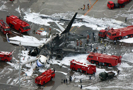 None of the 157 passengers and eight crew members was injured in the accident since the fire broke out after all of them got off the plane in notice of initial flame, airport and Japan's National Police Agency (NPA) officials said. "All 157 passengers evacuated through the emergency slides," Akihiko Tamura, a transport ministry official, told a press conference in Tokyo. He also said the eight crew members were confirmed alive. But Kyodo News said two people were taken to hospital and one ground crew member was hurt. The airline earlier put the passenger number at 155 as it did not count the two infants without tickets. China Airlines officials were quoted as telling that the fire broke out at around 10:35 a.m., eight minutes after landing, from the engine below the left wing of the Boeing 737-800 plane. While the cause of the fire is still unknown, the NPA denied any terrorist attack behind the accident. TV footage showed that strong fire and thick smoke rose from middle and end part of the plane before about ten fire department vehicles and about a hundred firefighters gathered around the plane to put off the fire in about 40 minutes. The plane, which is numbered flight 120, broke into two pieces and tilted down to the ground, with its left body almost burnt out, latest NKH footage showed. The plane departed Taipei earlier in the day and landed at Naha, the capital of Okinawa, at 10:27 a.m. local time (0127 GMT). |
