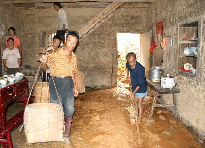 | Local residents clean their house which is hit by a mudslide in Xingguo County, East China's Jiangxi Province on August 20, 2007. Typhoon Sepat moved into the province on Monday, bringing torrential rain and high winds which caused havoc in a number of towns. [Xinhua] |