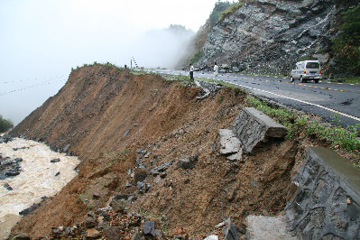 | A road is partly damaged by a landslied triggered by typhoon Sepat in Xinguo County, East China's Jiangxi Province on August 20, 2007. Typhoon Sepat moved into the province on Monday, bringing torrential rain and high winds which caused havoc in a number of towns. [Xinhua] |