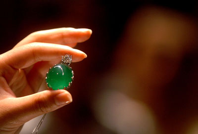 An emerald pendant is displayed at a jewelry shop in Ningbo, East China's Zhejiang Province on August 21, 2007. The pendant, weighing 27.7 grams, and 221 diamonds encircling the emerald, is valued at 28,508, 8 80 yuan (US$3.75 million). [newsphoto]