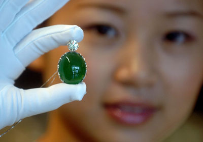 A sales woman displays an emerald necklace pendant at a jewelry shop in Ningbo, East China's Zhejiang Province on August 21, 2007. The pendant, weighing 27.7 grams, and 221 diamonds encircling the emerald, is valued at 28,508, 880 yuan (US$3.75 million). [newsphoto]