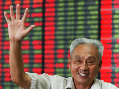 Updated: 2007-08-23 17:32 ![]() An investor shows his open hand signalling five at a stock brokerage in Yangzhou, East China's Jiangsu Province, August 23, 2007. China's benchmark Shanghai Composite Index surpassed the 5,000 mark for the first time on Thursday. It closed at 5,032.49 points, an increase of 1.03 percent from the previous session. [Xinhua] |