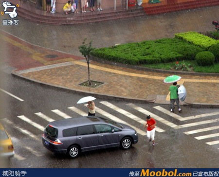 A man helps an elder woman on the street as a young woman volunteers to give them her umbrella in this touching scene in Qingdao, Shandong Province posted online at www.moobo.com on July 1. [moobol.com]