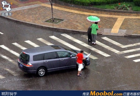 The man continues to help the elder woman on the street as the young woman returns to her car in this touching scene in Qingdao, Shandong Province posted online at www.moobo.com on July 1. [moobol.com]
