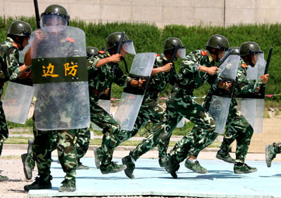 Armed police officers take part in an anti-terror exerciese in Shanghai on August 24, 2007. The drill is part of the preparations for the upcoming Special Olympics. [Xinhua]
